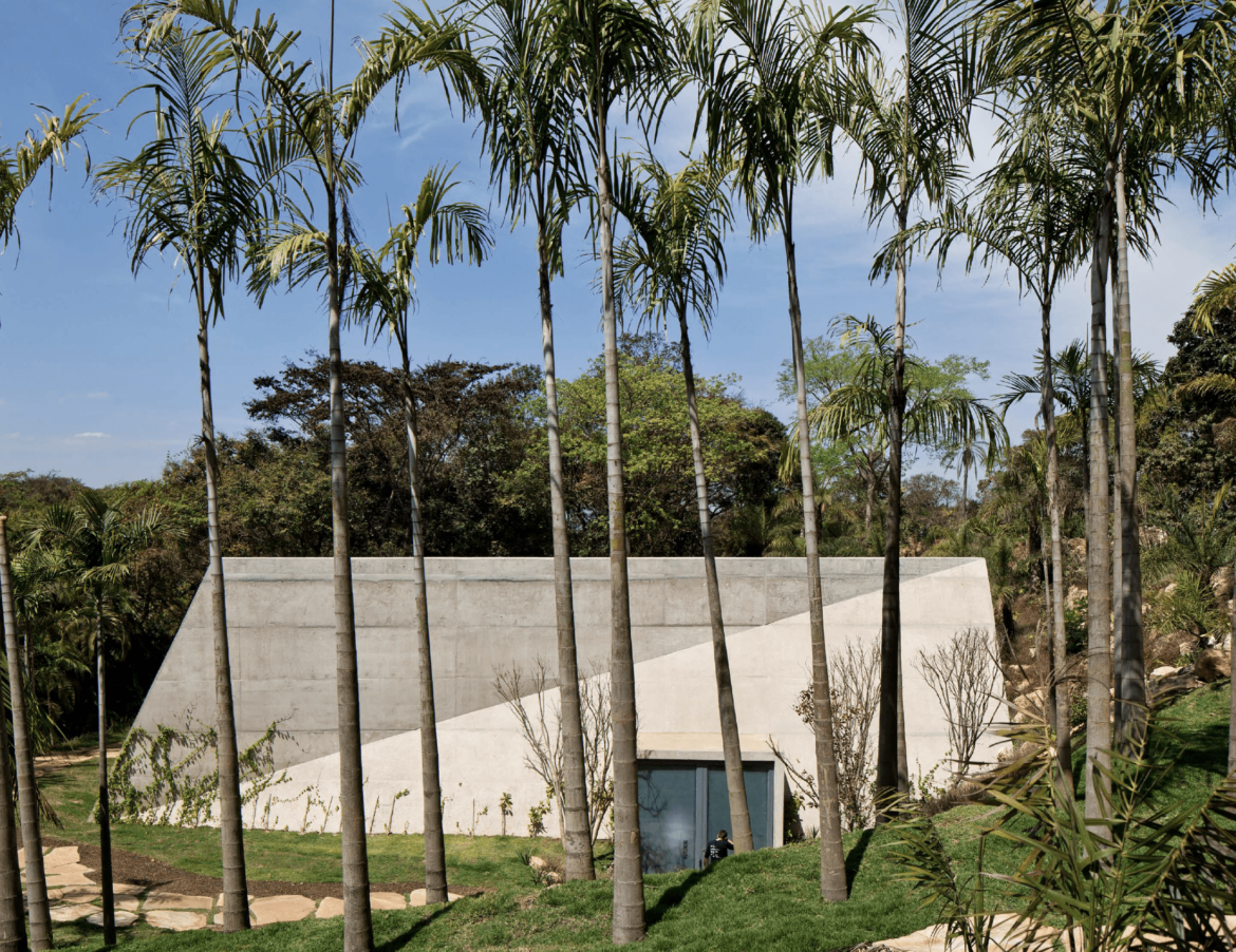The Lygia Pape Pavilion is located at Inhotim, a contemporary art museum located in the mountains of Minas Gerais in Brazil. The Pavilion is such a unique building because it was designed specifically to shelter contemporary artist Lygia Pape’s work, “Tteia 1C.” This specific piece of Pape’s is a series of golden threads bound to the floor and ceiling to create tridimensional figures that visually intersect in a dark room. The Pavilion is the permanent home for this piece.