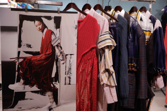 Showroom of M.F.A. fashion design students at Kimball Studio during New York Fashion Week. On the mannequins (L–R): looks by Yoonsuk Lee, M.F.A. fashion design, and by Snežana Aničić-Van Pelt, M.F.A. fashion design. Photo by Randy Brooke.