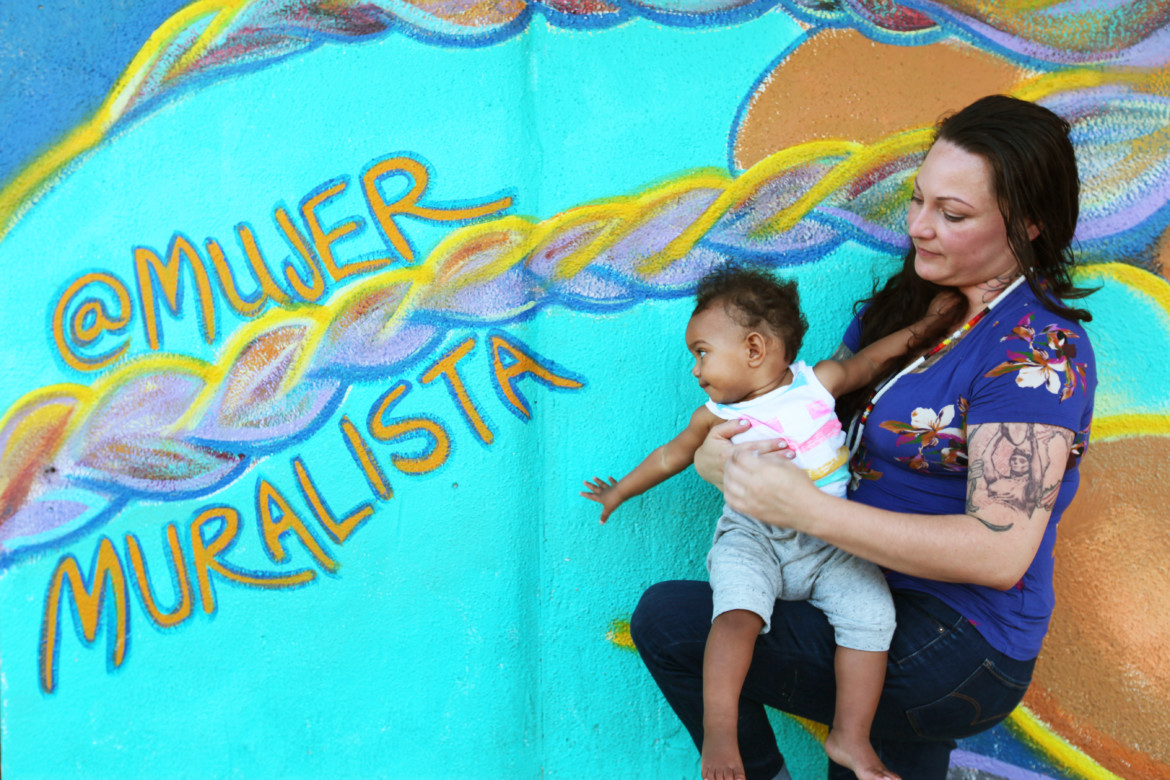 Mujer Muralista with her 11-month-old, Soledad. “She’s watching everything I do.” Photo by Erasmo Guerra.