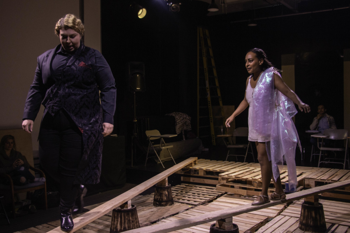 Academy of Art University’s School of Acting (ACT) presented Sarah Ruhl’s “Eurydice.” The play, featuring graduate students and directed by ACT instructor Bob Shryock, is a retelling of the Greek myth of Eurydice. Eurydice (Maeron Yeshiwas) marries Orpheus (Jeremy Marquis), a musician, and on the night of the wedding party she falls to her death (and gets trapped in the Underworld) when she’s pursued by someone referred to in the program as “Nasty Interesting Man / Lord of the Underworld” (Valerie Compton). Orpheus descends into the Underworld to rescue his wife, only to lose her again when she decides to remain among the dead and the creepy chorus of Stones who are always hissing at and giving her the Dos and Don’ts for dead people.