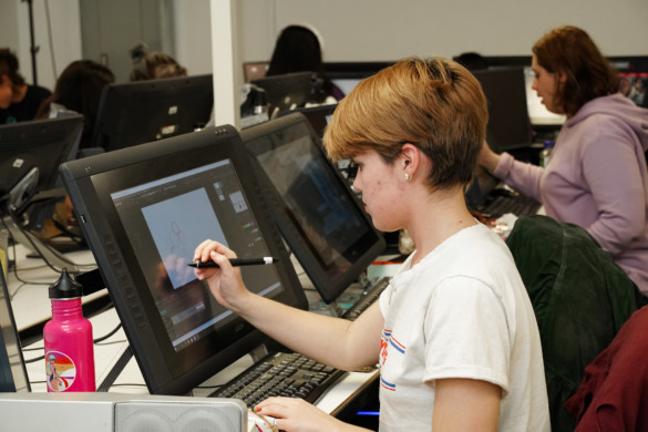 “It really teaches them real-life skills in terms of how to work with different people,” said Daisy Church, associate director of 2-D Animation and the on-site coordinator for the ANM contingents. This experience is a great way to forge connections that often lead to jobs, she said. Her organizing began long before, in motivating students both onsite and online to sign up. For the first time, ANM teams comprised of online student participants. On Friday, Church streamed online students into the main basement workspace so they could feel connected to onsite participants. Also for the first time, ANM had stop-motion animation teams.