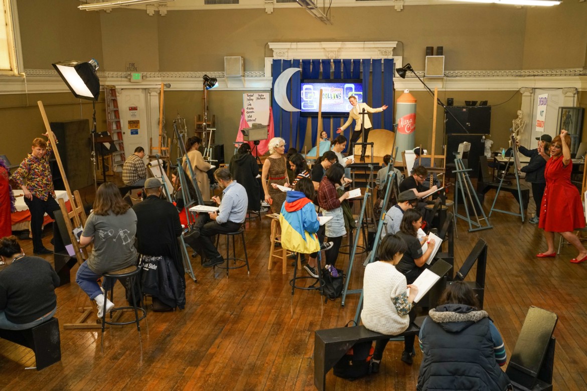The School of Illustration models as the characters from the musical “Hairspray”: (Back row, from left to right) Robert Courtney aka “Dragonfly” as Edna Turnblad, Jonathan Bowling as Wilbur Turnblad, Brian Gabel as Corny Collins, Andre Speckert as Link Larkin, Aaron Bogan as Seaweed J. Stubbs, Millie Marcelin as Motormouth Maybelle, Tulle Snell as Little Inez. (Front row, from left to right) Morgan Wilke as Amber Von Tussle, ILL Model Coordinator Veronique Bohne as Velma Von Tussle, (seated) Tricia Lapena as Penny, and Jessica Chan as Tracy Turnblad. Photo by Mateo Tayamen.