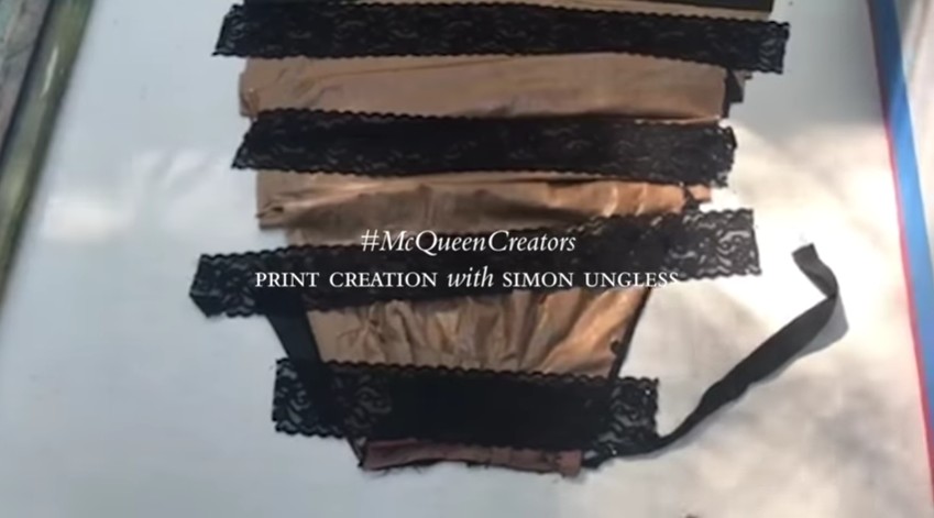 In the video below, Ungless, a long-time Alexander McQueen friend and collaborator, guides viewers through his screenprinting process from his studio in which he adds prints to a skirt from 1860 and a Victorian corset top.