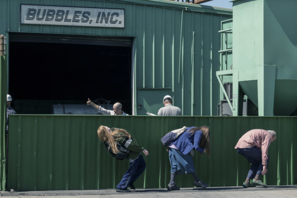 Wood as the disengaged, emotionally-deprived Old Dolio is what turns this con artist film into a whimsical coming-of-age dramedy. Because of her parents’ narcissistic worldview and rejection of material comforts—they live in the office of a bubble factory that leaks daily—Old Dolio never had the chance to become her own person, let alone make any meaningful human connections. So when Robert and Theresa dote on Melanie, Old Dolio’s odd and stoic reality is turned upside down as she and this newcomer form an unlikely connection.