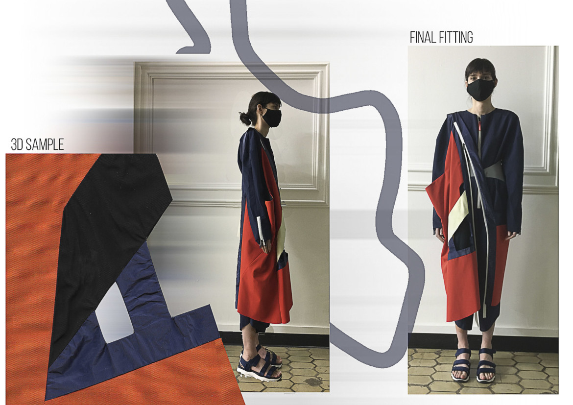 “One of my brother’s processes for transportation is to draw the orthographics of a car on the wall using tape. It’s a more physical drawing style,” Delić said. “So, I decided to take that two-meter car that was on the wall and put it to fabric. It was my way of translating that expression of 3-D in transportation to fashion—my interpretation of how I would take this and start draping with it.”
