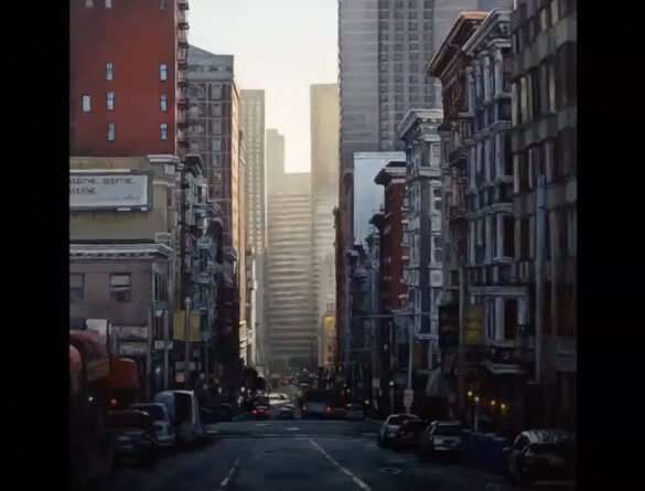 Kim’s specialty is cityscapes—the Academy instructor and painter/illustrator spotlights spectacular views of San Francisco streets, from a rain-slicked Market Street to a breathtaking dusky vista of Bernal Hill. Kim’s detailed paintings are especially time-consuming and technical due to the sheer number of buildings and windows—one of the reasons he decided to re-enroll in art school for his M.F.A. and further refine his skills.