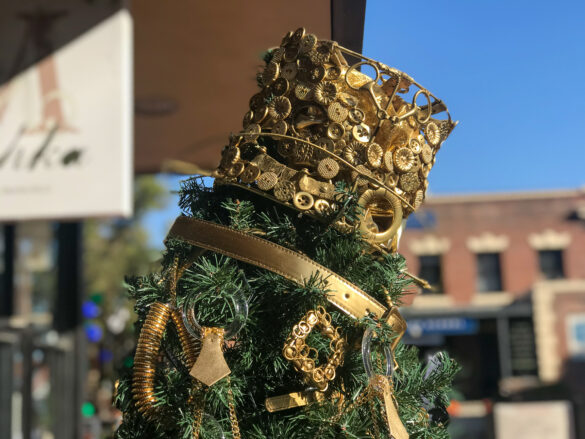 Fashion students and faculty reimagined belts and chains into gilded garlands, cuffs, and rhinestone-studded high heel shoes as ornaments. Capping off their tree’s look is a fabulous top hat fashioned out of wire and buttons.