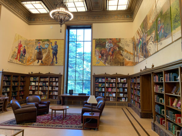 Gillis Hall, named for California State Librarian James Louis Gillis, resides on the third floor of the State Library and serves as a reading room for the public. Since 1928, the walls of Gillis Hall have played host to the artwork of Maynard Dixon (1875–1946).